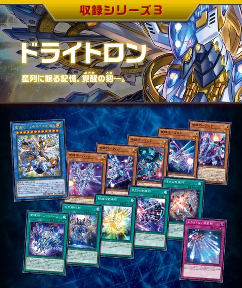 ①:自分の手札・フィールドから、このカード以外の「ドライトロン」モンスターまたは儀式モンスター1体をリリースして発動できる。このカードを手札・墓地から守備表示で特殊召喚する。その後、デッキから儀式魔法カード1枚を手札に加える事ができる。この効果を発動するターン、自分は通常召喚できないモンスターしか特殊召喚できない。